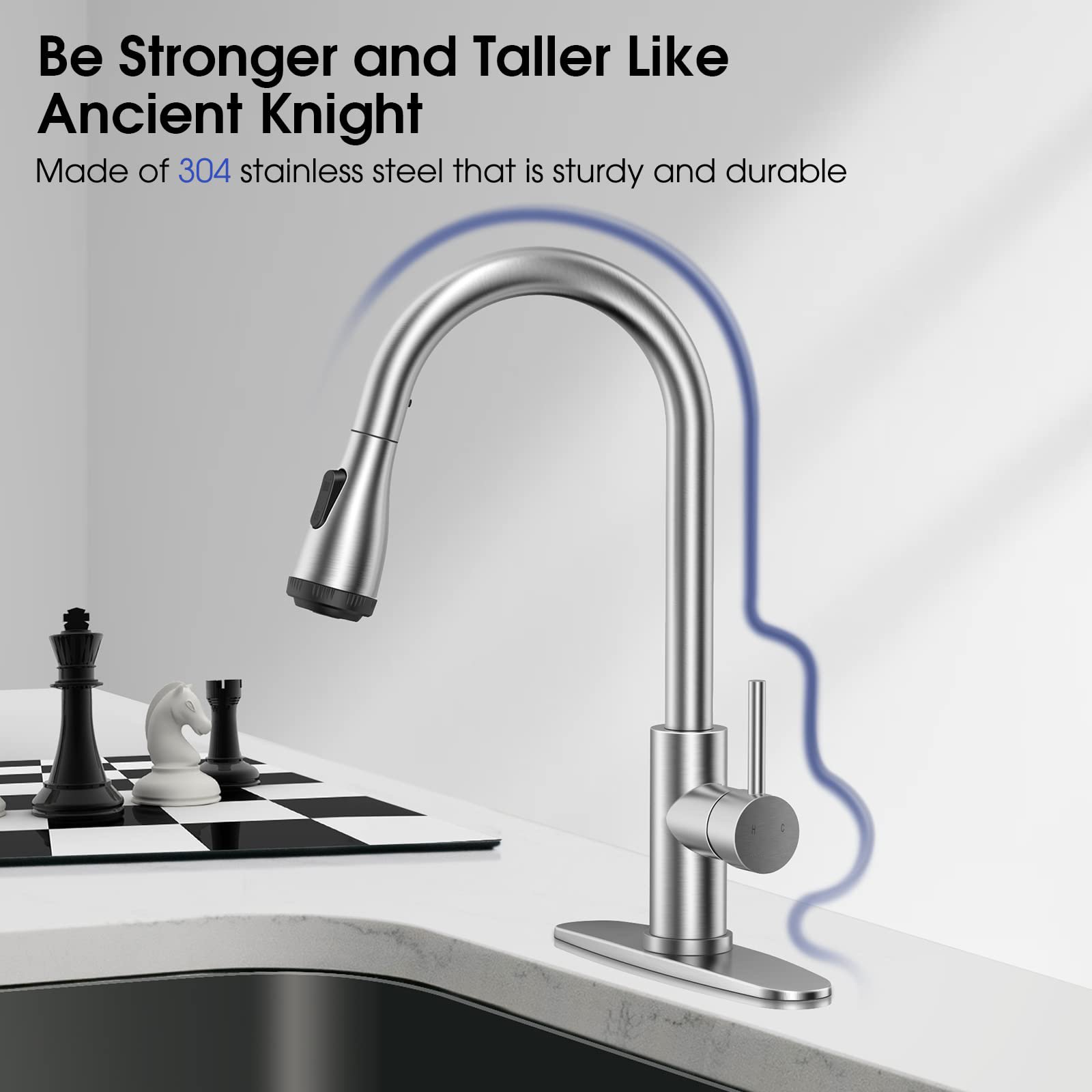 Dual Motion Sensor Function Detection - Pull the faucet head down to automatically eject and release to shut off the water as soon as the spray head is retracted to its original position. Please NOTE to turn on the kitchen faucet handle to launch the infrared motion sensor. This smart automatic design will help prevent you from touching the faucet when your hands are either with soap; stains or dirt.Environmental Friendly Power - Saving Design: The Touchless Kitchen Faucet contains an 180s auto off feature. If you forget to turn off the kitchen sink faucet after using it; it will automatically shut itself down after 180s; and so to achieve the water-saving purpose. Its brushed nickel design is completely lead-free. (Please note: the batteries are excluded).4 Mode Pull Down Kitchen Sprayer - The Kitchen Sink Faucet contains 4 different spraying function: Stream Mode; Spray Mode; Mist Mode; Double Blade Mode. Each mode will satisfy with different applications and you will find this Touchless Kitchen Faucet is a PERFECT helper in dishwashing. Besides; you might pull down the 13.5 inch kitchen sprayer to rinse as most of the kitchen sink area as you wish. The Kitchen Sprayer is replaceable.Easy Installation - With the fast&easy understanding tutorial of this kitchen faucet; its installation only needs less than half an hour to complete the installation and testing. As long as the battery box is hold stably; you will not need to nail the battery box onto the wall.Overall height:17.7"; Spout Height: 8.66"; Spout Reach:8.58"; The Touchless Kitchen Faucet includes a deck plate to cover the extra kitchen faucet holes. Please hang the sensor box to keep it dry. Please avoid the sensor box being wet; which will cause the product's sensing function to fail or reduce the service life.